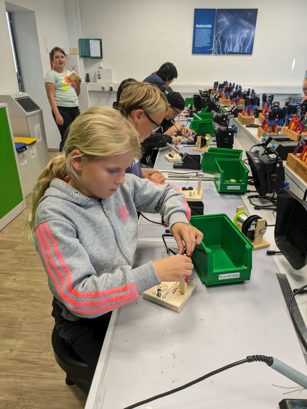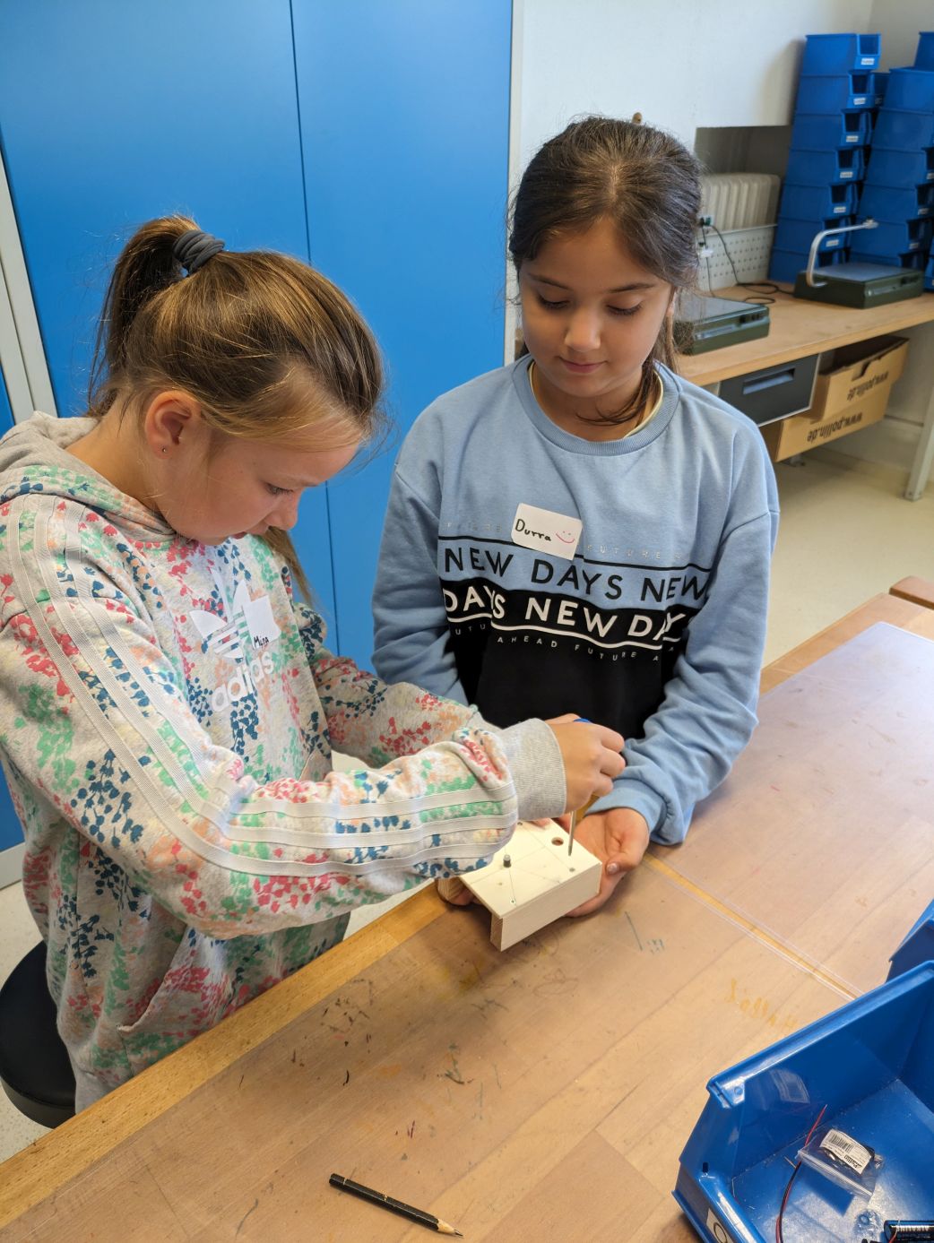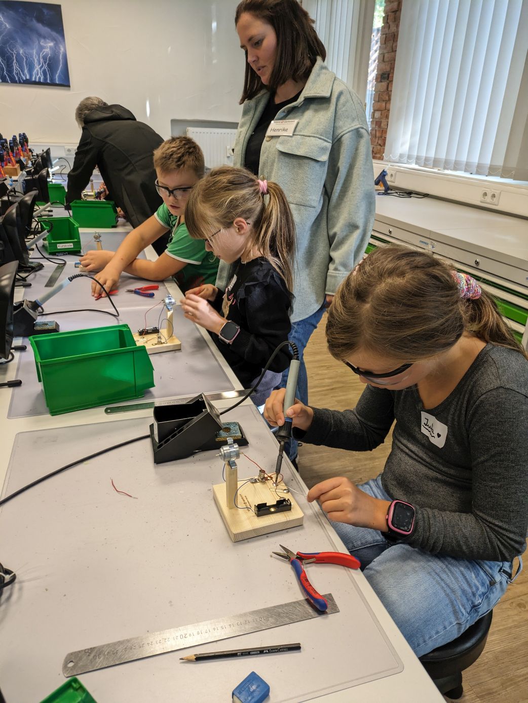 Einen produktiven Tag verbrachte die Klasse 4b in der Wissenswerkstatt Diepholz. Während eine Gruppe einen eigenen Ventilator baute, stelle die andere einen elektrischen Würfel her. Die Kinder mussten selbst bohren, schrauben und löten - alles natürlich unter der fachlichen Anleitung und Aufsicht der Mitarbeiter*innen der Wissenswerkstatt. Dem eigentlichen Bauen vorausgegangen war eine kurze Einheit zum Thema Strom. Was brauche ich, um eine Lampe zum Leuchten zu bringen? Die Kinder fanden es ganz praktisch heraus und waren danach bestens für die Arbeit an ihren Werkstücken gerüstet.