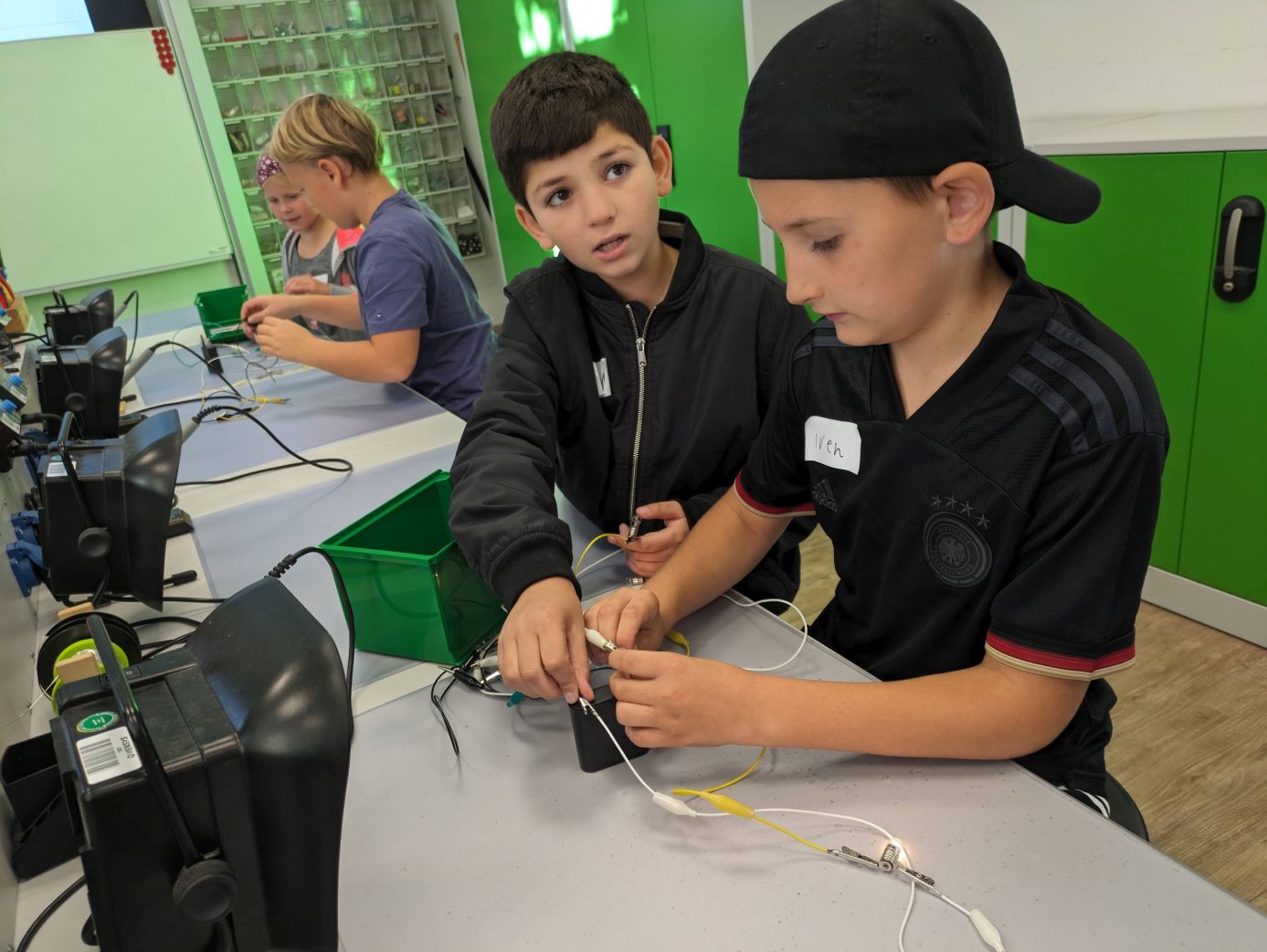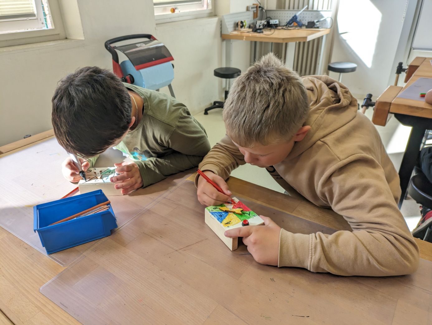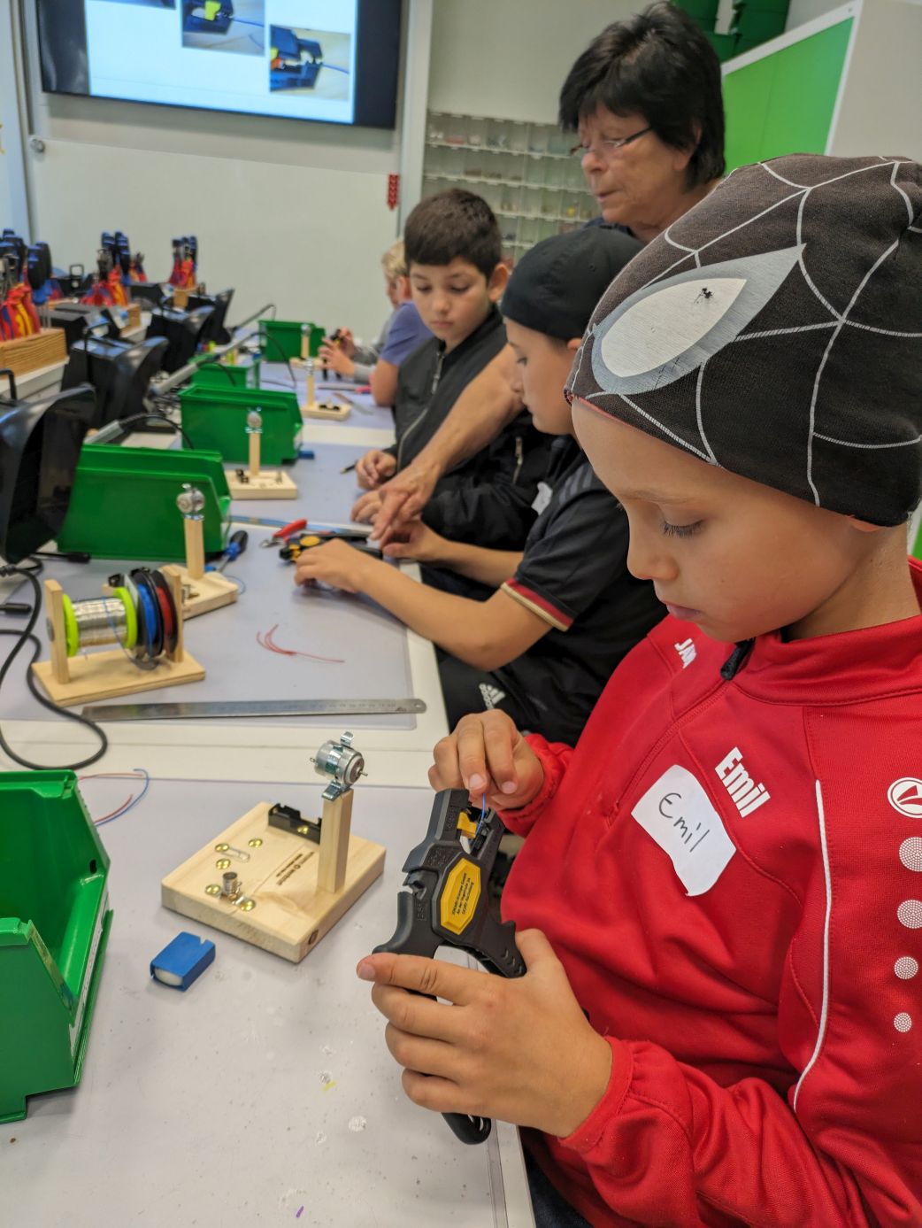 Einen produktiven Tag verbrachte die Klasse 4b in der Wissenswerkstatt Diepholz. Während eine Gruppe einen eigenen Ventilator baute, stelle die andere einen elektrischen Würfel her. Die Kinder mussten selbst bohren, schrauben und löten - alles natürlich unter der fachlichen Anleitung und Aufsicht der Mitarbeiter*innen der Wissenswerkstatt. Dem eigentlichen Bauen vorausgegangen war eine kurze Einheit zum Thema Strom. Was brauche ich, um eine Lampe zum Leuchten zu bringen? Die Kinder fanden es ganz praktisch heraus und waren danach bestens für die Arbeit an ihren Werkstücken gerüstet.