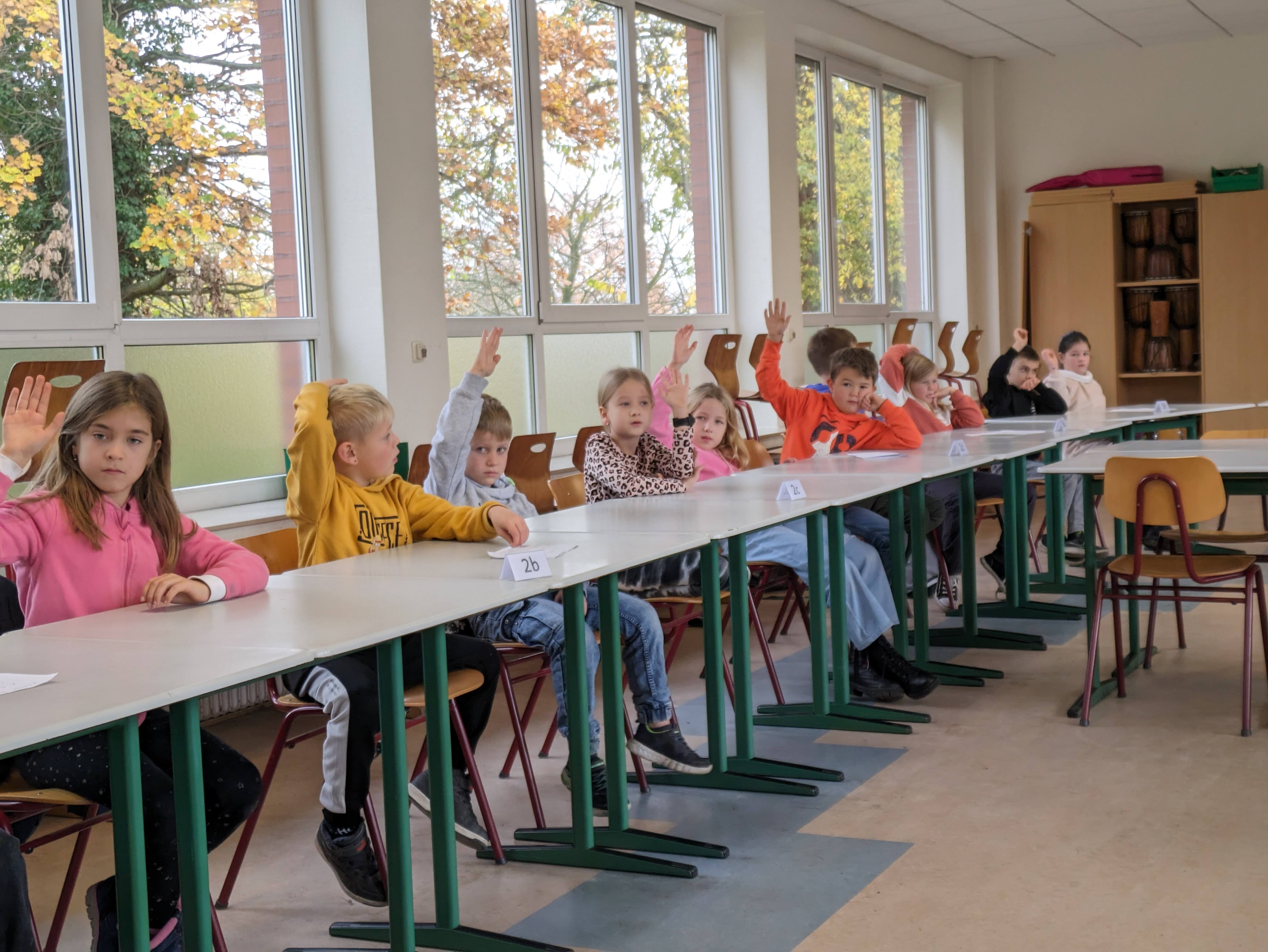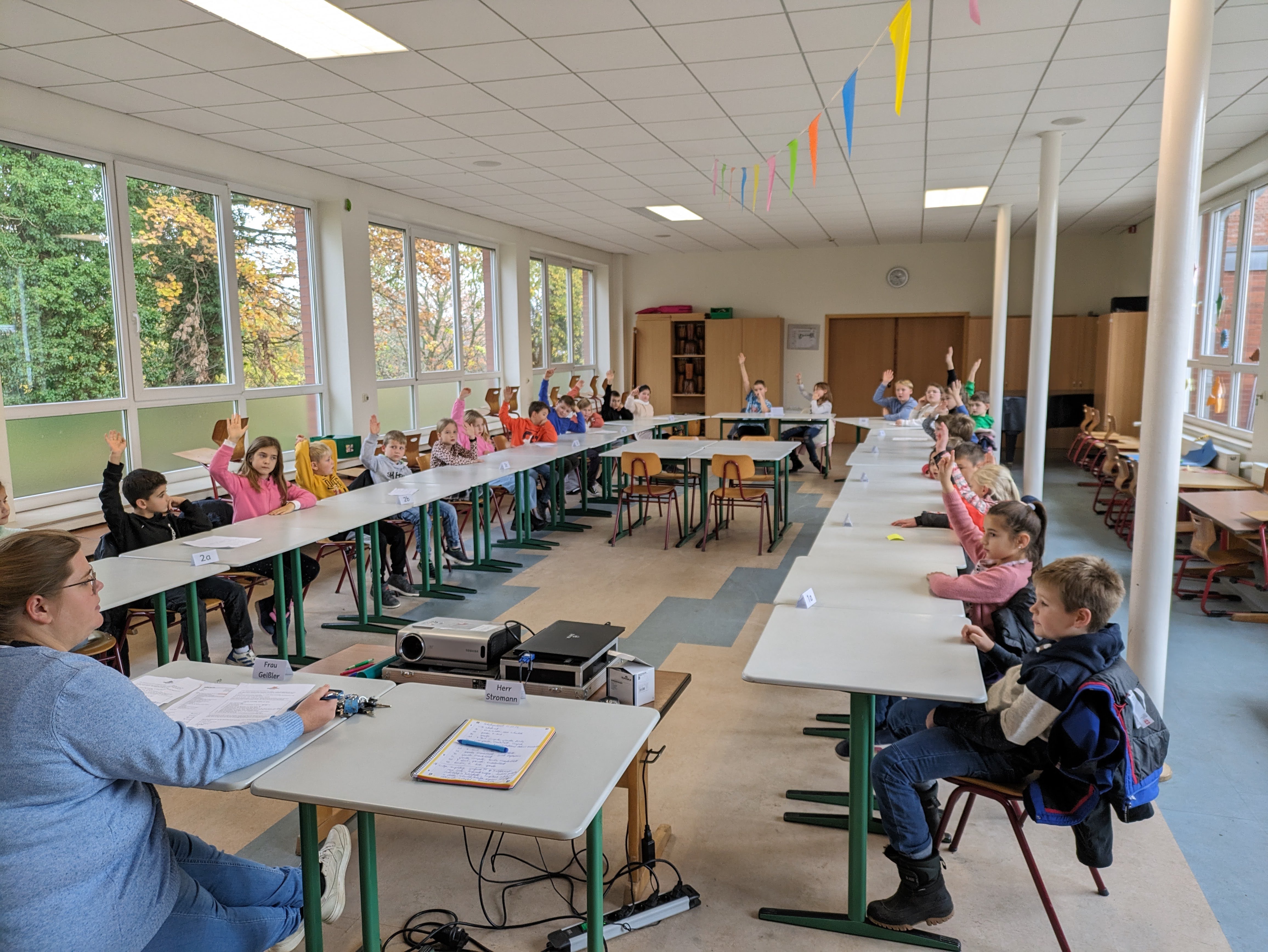 Zum ersten Mal kamen alle Klassensprecher*innen unserer Schule zum Schülerrat zusammen. Das Gremium, das von Frau Geißler und Herrn Stromann moderiert wurde, tagte in der Aula, um Wünsche und Anliegen, die in den einzelnen Klassenräten besprochen wurden, zu bündeln. So ging es unter anderem darum, welche Anschaffungen sich die Kinder vom Geld des Sponsorenlaufes wünschen. Hierzu gab es in allen Klassen Abstimmungen. Im Schülerrat wurden dann drei Verwendungszwecke per Abstimmung ermittelt: Spenden an bedürftige Kinder, eine Freundschaftsbank für die große Pause sowie Knautschbälle zur besseren Konzentration.