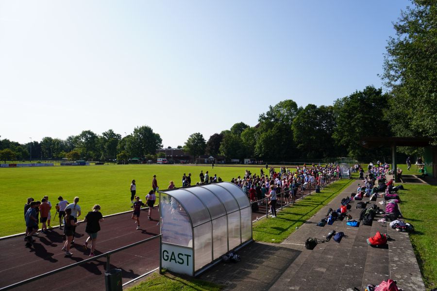 Gegen 8:30 Uhr wurde es im Sundering-Stadion in Barnstorf Stück für Stück immer voller. Der Förderverein hatte sich am Eingang postiert, um alle Besucher mit Getränken und kleinen Snacks versorgen zu können, das DRK war für mögliche Zwischenfälle gewappnet, und alle Rundenzähler waren bereit, um fleißig alle gelaufenen Runden zu zählen. Auch die Kinder waren voller Tatendrang und konnten den Start des gemeinsamen Laufes kaum abwarten. Pünktlich um Viertel vor neun konnten wir gemeinsam mit dem Aufwärmprogramm starten, um dann ab 9 Uhr mit dem Laufen zu beginnen. Die Jahrgänge wurden zunächst gestaffelt auf die Laufbahn geschickt, und kaum war der letzte Jahrgang mit seiner ersten Runde gestartet, konnte man auch schon die ersten Kinder sehen, die bereits eine Runde geschafft hatten.