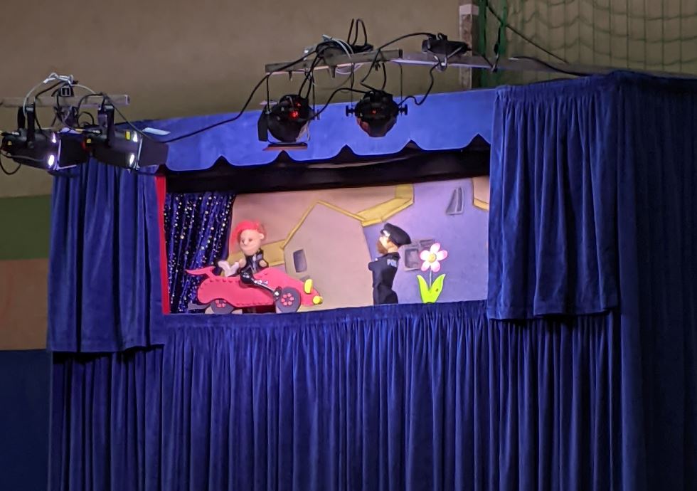 Das Puppentheaterstück für die Klassen 1 und 2 trug den Titel "Geschnallt!?". Die Kinder machten unter anderem Bekanntschaft mit Hund Fiffi, der von zu Hause ausbüxt, und mit Opa Ewald, der sich eigentlich nie anschnallt. Was dadurch passieren kann, konnten die Schüler*innen sehr eindrucksvoll in einer Szene mit einer Schlittenrutsche beobachten, in der Enkelin Maya einmal mit und einmal ohne Gurt heruntertutscht. Mit dem Lied "Im Auto unterwegs" endete schließlich dieses lehrreiche Stück.
