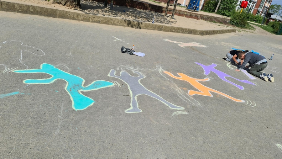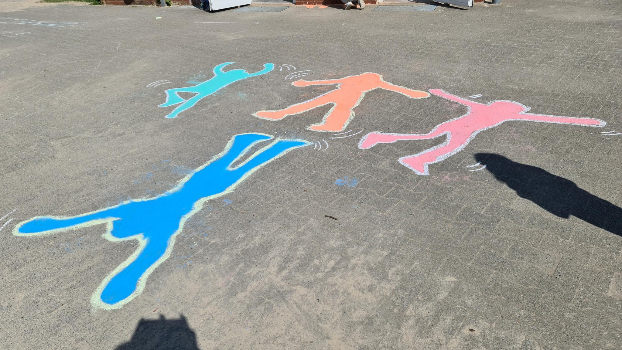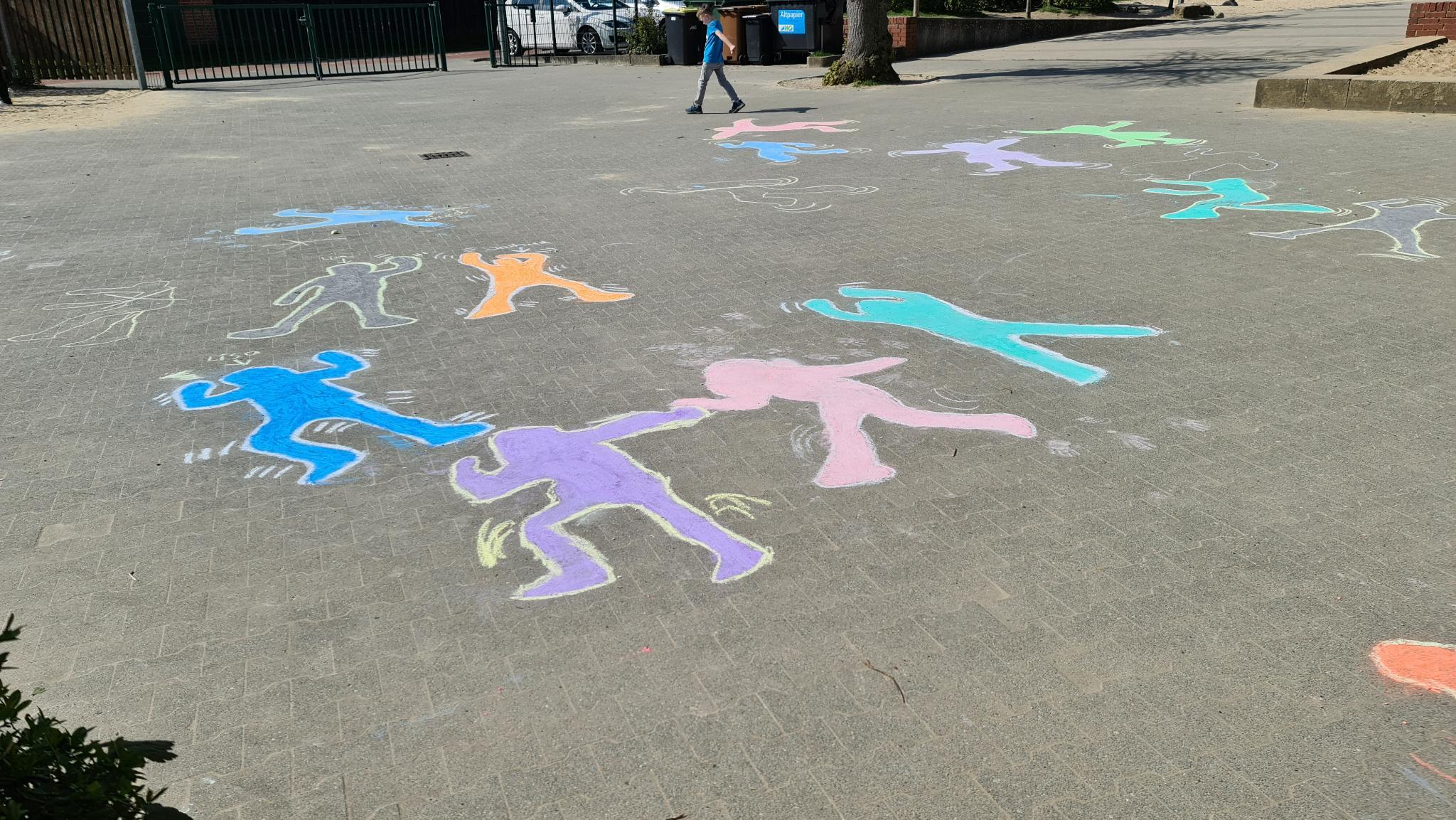 Im Kunstunterricht eiferte die Klasse 3a nun Pop-Art-Künstler Keith Haring nach. Unter der Anleitung von Klassen- und Fachlehrerin Frau Ohlig entstanden auf dem Schulfhof viele bunte Kreidezeichnungen. Die Kinder machten es damit so wie Haring, der mit seinen großflächigen Wandmalereien im öffentlichen Raum die Kunst für jedermann zugänglich machen wollte. Die Ergebnisse können spätestens bis zum nächsten Regenschauer von allen Besucher*innen der Schule bewundert werden.